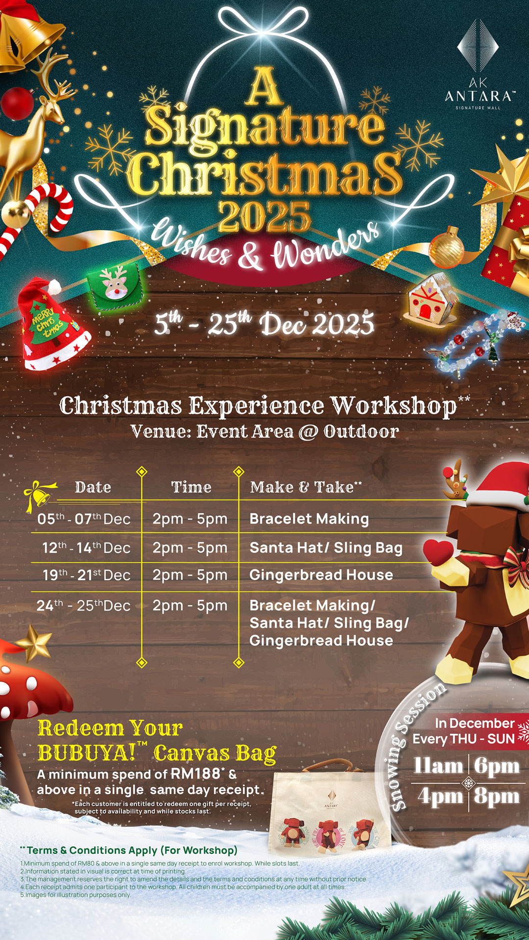 Celebrate the festive season at AK Antara Signature Mall with A Signature Christmas 2025: Wishes & Wonders, featuring workshops, performances, games, snowfall sessions, and festive rewards throughout December.