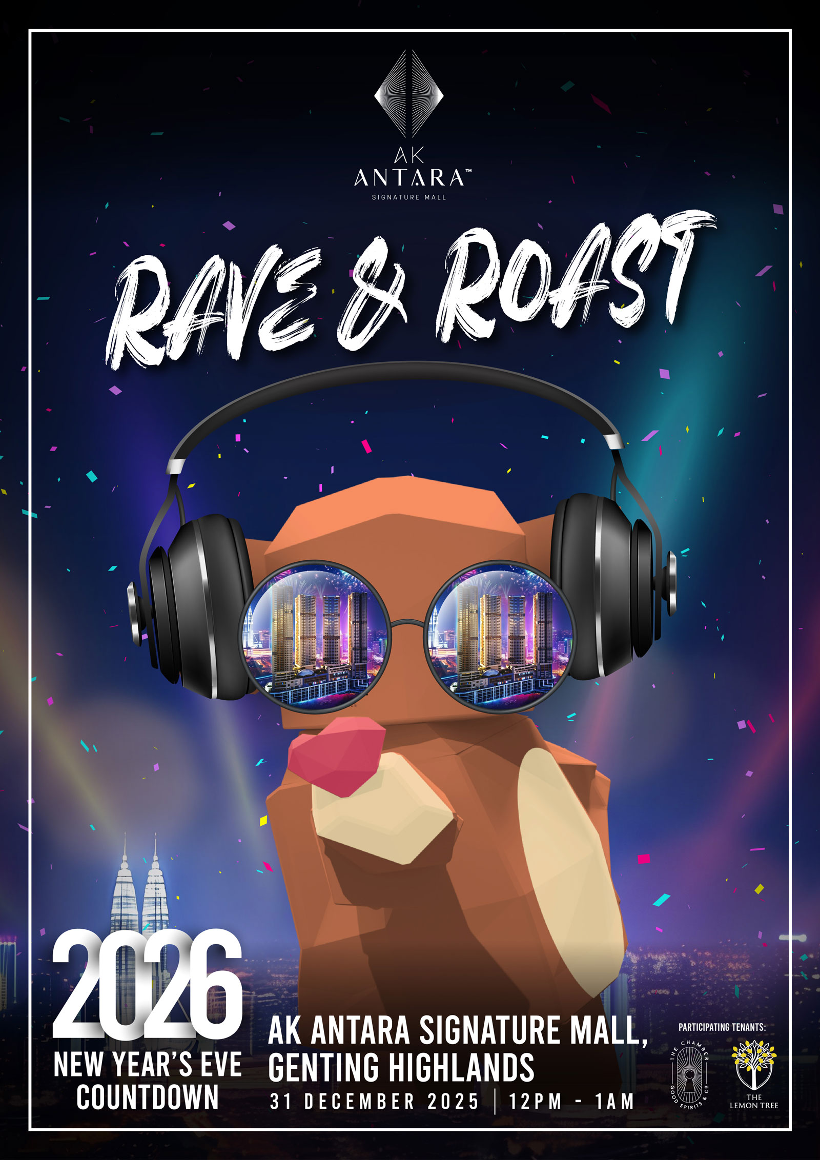 Celebrate New Year’s Eve at AK Antara Signature Mall with Rave & Roast — a full-day countdown event on 31 December 2025 featuring daytime activities, live music, and a DJ countdown to welcome 2026.